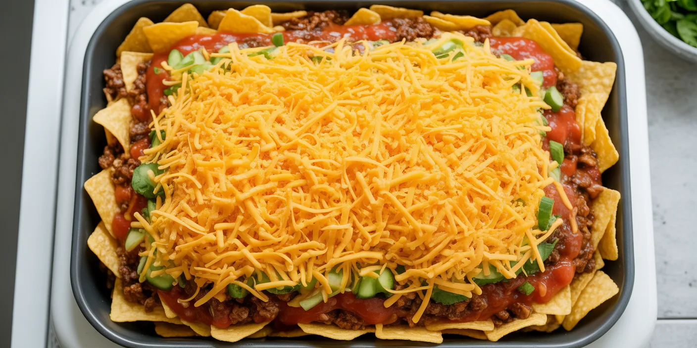 Chips went soggy: filling too wet or oven too cool. Reduce filling longer before layering, bake at full 220°C (425°F). Cheese not browning: oven wasn’t fully preheated — or add 2–3 minutes under the broiler at the end. Filling too dry: add a splash more beef broth or salsa before layering. For a very large crowd: double everything in a 20×12 inch hotel pan, bake time stays roughly the same.