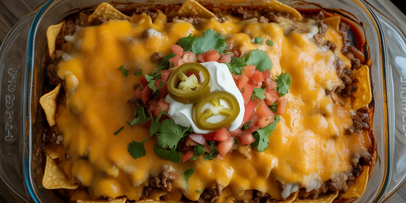 Night before: brown and season taco filling completely, refrigerate. Shred cheese. Prep all toppings — dice tomatoes, slice jalapeños, make guacamole (press cling film on the surface to prevent browning). Day of: warm filling briefly, assemble casserole (chips → filling → salsa → cheese), bake 18–22 min. Active party-day work = about 10 minutes.