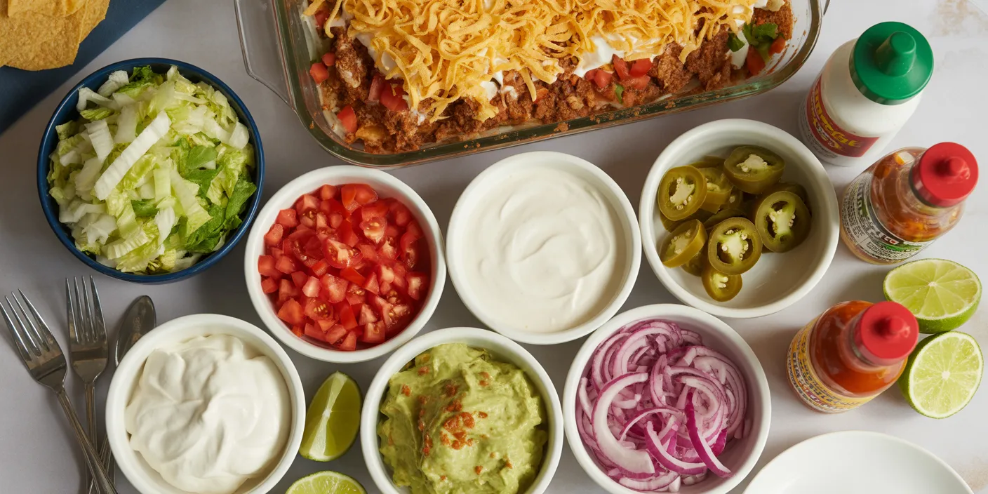 Instead of adding toppings to the whole casserole, bake with cheese only. Set up a topping bar: small bowls of shredded lettuce, diced tomatoes, jalapeños, sour cream, guacamole, pickled onions, salsa, hot sauce. Put spoons or tongs in each bowl. Label anything unusual. This prevents sogginess and lets guests customise — the best approach for any gathering over 6 people.