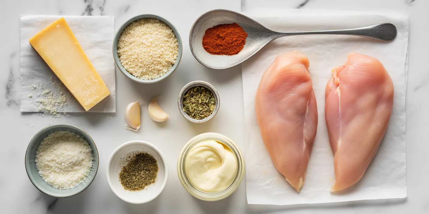 Mayonnaise is an emulsion of oil and egg. The egg proteins help the Parmesan crust bond to the chicken during cooking — it creates a tacky surface the breadcrumbs grip onto. Olive oil is too thin and the crust slides off. If your crusted chicken coating kept falling off before, this is the fix.