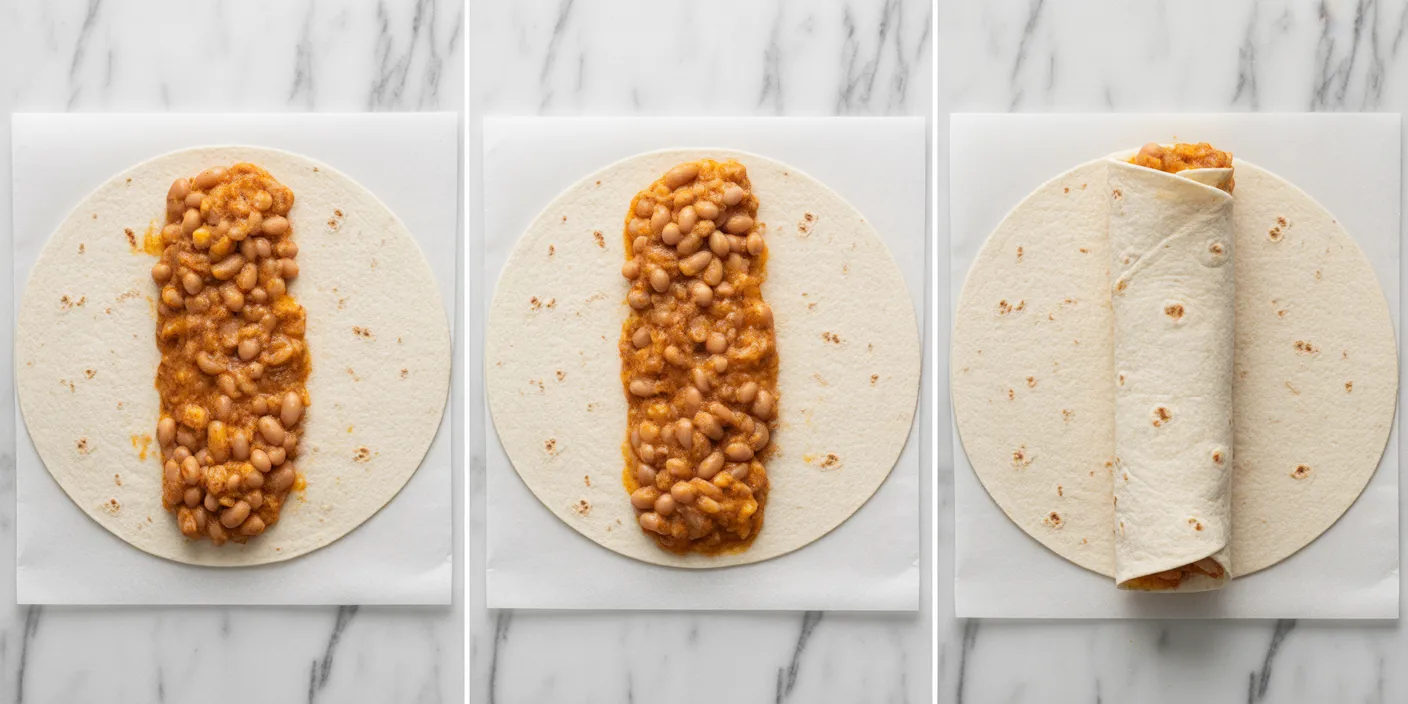 1. Season the beans — plain canned refried beans taste flat. 2 minutes of cooking with garlic and spices transforms them. 2. Warm the tortillas before rolling — cold tortillas crack. 3. Toast the finished burrito in a dry pan — this step is what makes it crispy outside, melted inside.