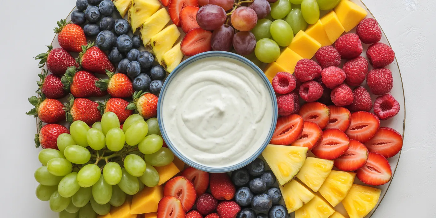 Group fruits by colour in curved sections radiating from the dip bowl. Don’t mix everything together — colour grouping is what makes a fruit platter look intentional and beautiful rather than random.