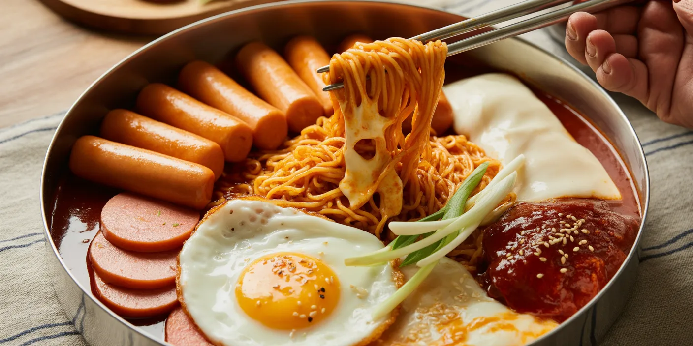 This is the bowl. Chewy rice cakes in a deeply spicy-sweet gochujang sauce, ramen noodles that soak up every bit of that broth, sausage slices, a perfectly fried egg on top, and melted mozzarella pulled dramatically with chopsticks. This is Korean street food at its most iconic.