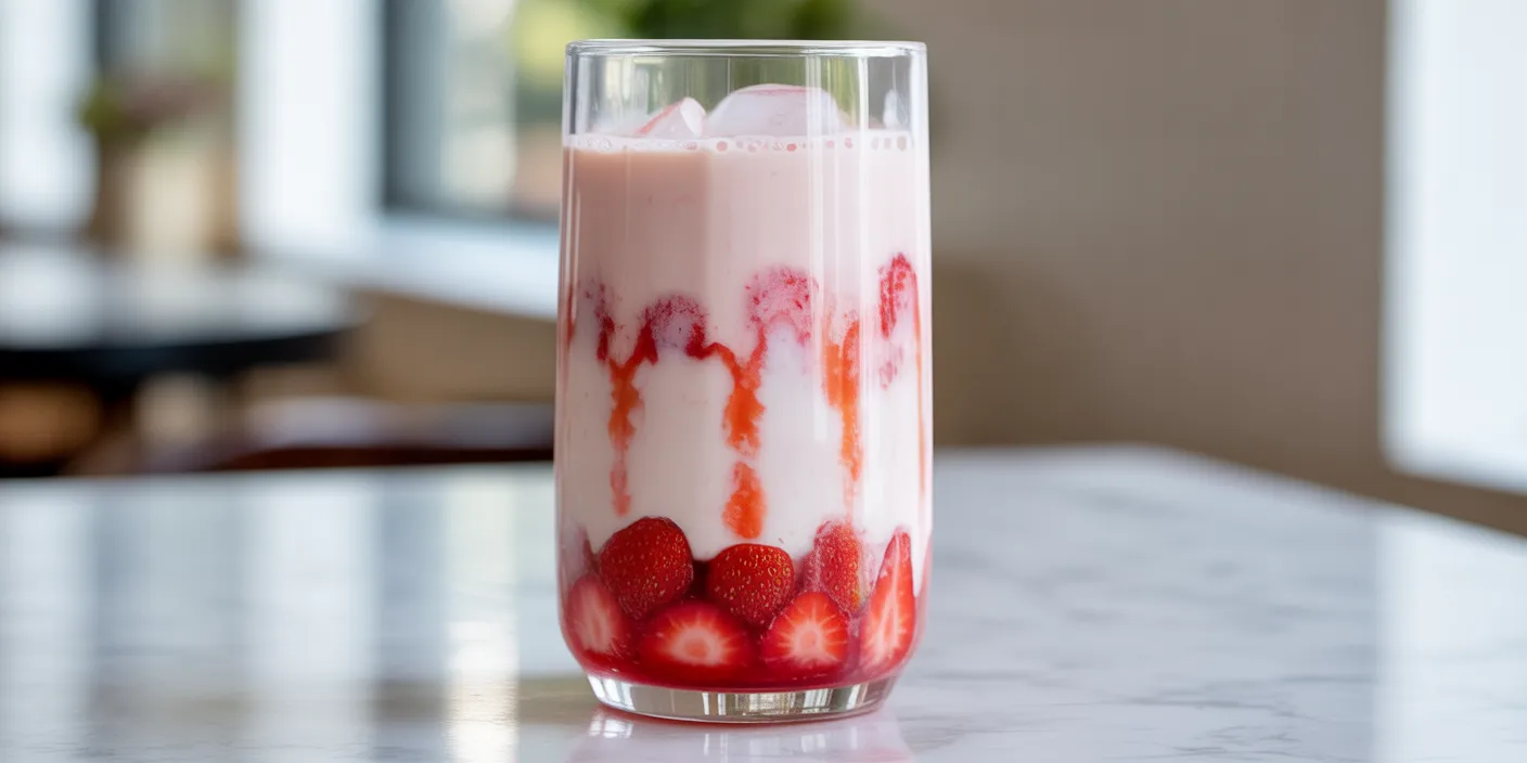 Add ice cubes. Pour cold milk slowly over the back of a spoon so it layers gently on top of the strawberries without fully mixing.