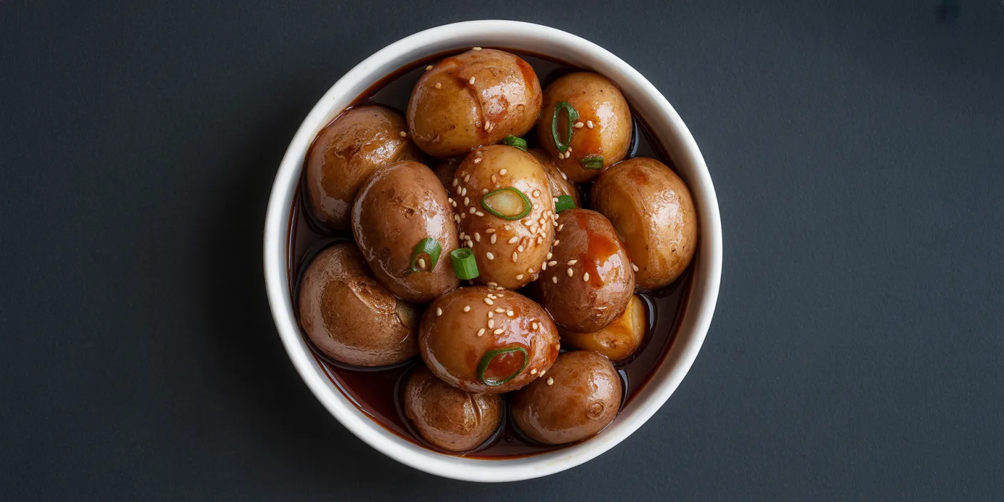 One of Korea’s most beloved banchan (side dishes) — small potatoes braised in a soy-honey-gochujang sauce until sticky, glazed, and deeply caramelized. They look like jewels and taste even better.