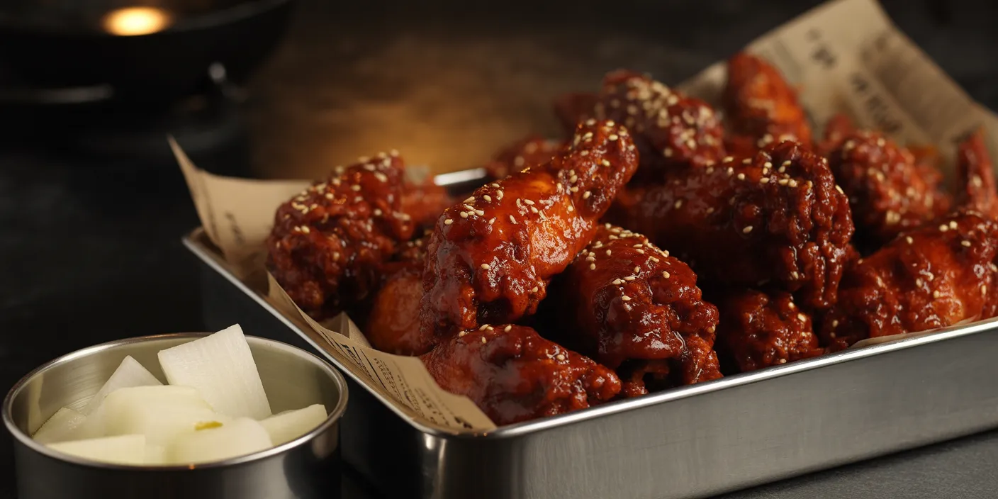 Double-fried for maximum crunch, then tossed in a sticky sweet-spicy soy glaze. Korean fried chicken has a completely different texture from Western-style — it’s thinner, crispier, and stays crunchy even after being sauced.