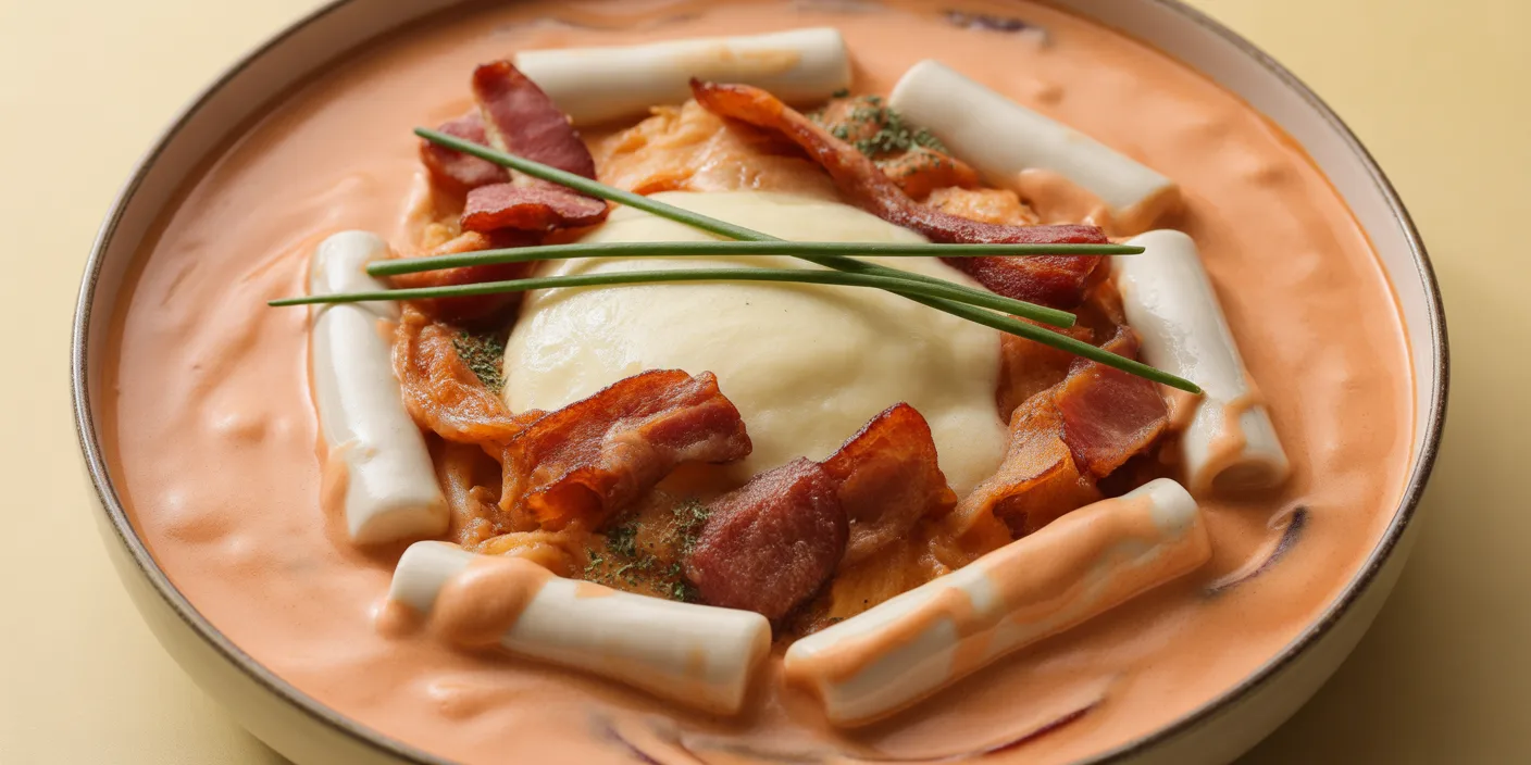 The creamy, pink-tinged version that took over Korean social media. Gochujang heat balanced with cream — less aggressive than the original but richer and arguably more addictive. The rose color comes from the cream mixing with the red sauce.