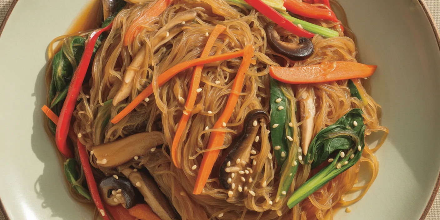Silky sweet potato glass noodles tossed with colorful vegetables and marinated beef in a slightly sweet, savory soy sauce. One of Korea’s most elegant dishes — and completely stunning when plated.