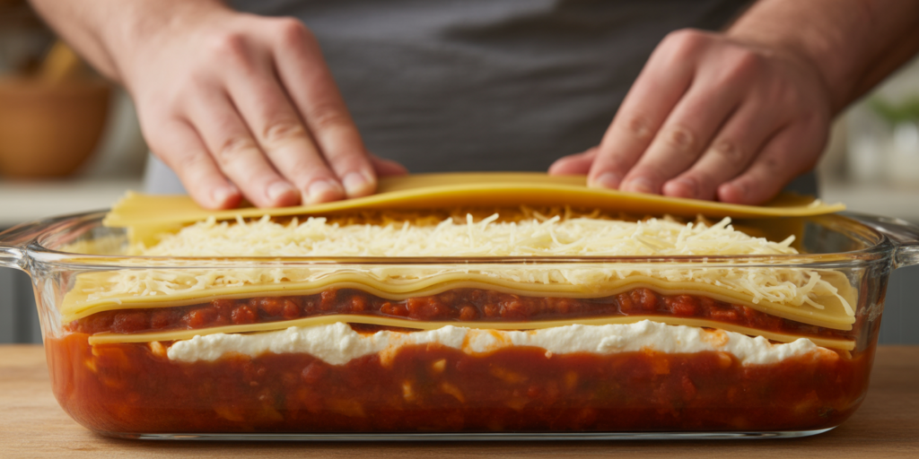 Key tip: Every layer of sauce should reach the edges of the pan — exposed pasta edges burn and dry out.