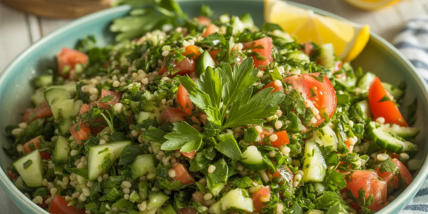 Tabbouleh is a fresh, vibrant parsley salad with bulgur, tomatoes, cucumber, and a zesty lemon dressing. It’s the perfect side dish for any Mediterranean meal, packed with fresh herbs and fiber.