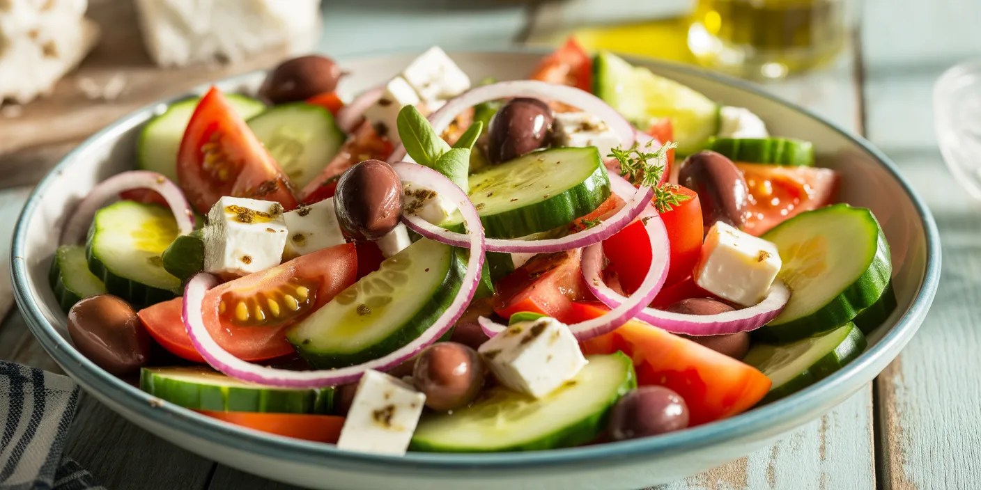 A Greek Salad is a staple of Mediterranean cuisine. Crisp vegetables like cucumbers, tomatoes, and red onions, paired with olives and feta cheese, make this salad a refreshing and satisfying dish. Drizzled with a simple olive oil and lemon dressing, it’s the perfect side dish for any Mediterranean meal.