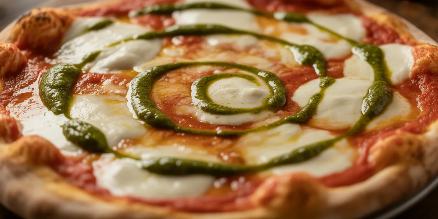 For a unique twist on a classic, combine Margherita and pesto for a flavorful and creamy pizza. This pizza brings together the freshness of tomatoes and basil with the bold flavors of pesto.